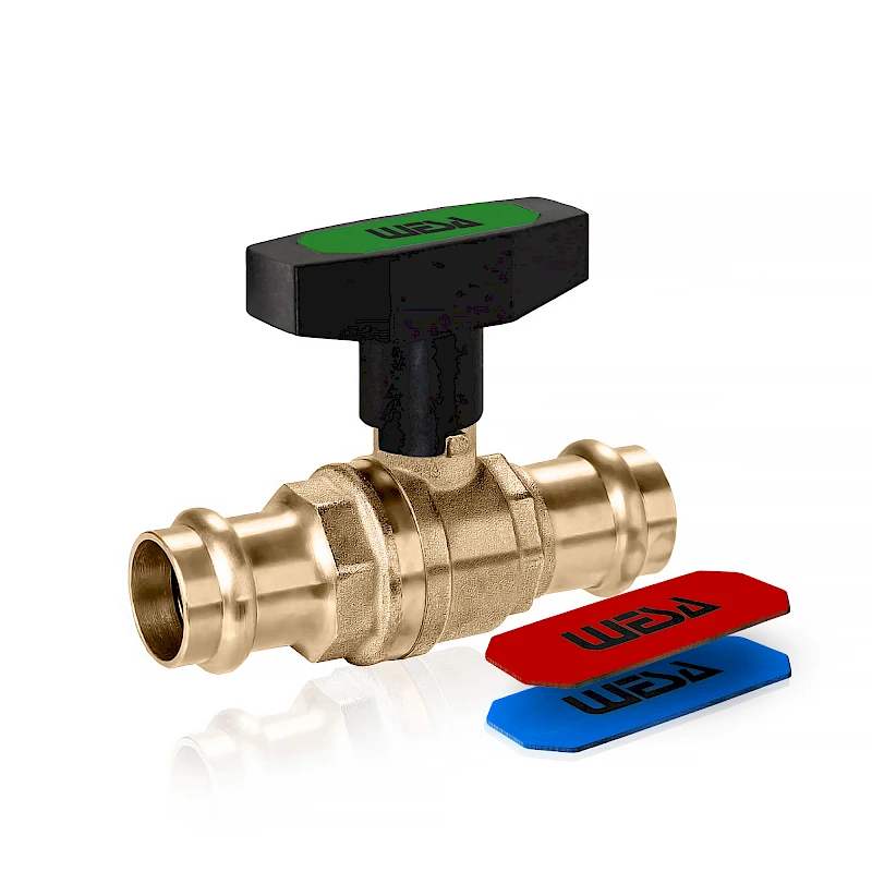 Body/ball/seal CW510L/CW510L/PTFE/EPDM, T-handle black plastic, green/red/blue WESA clip, cavity-free ball, full bore, with press connection V/M contour