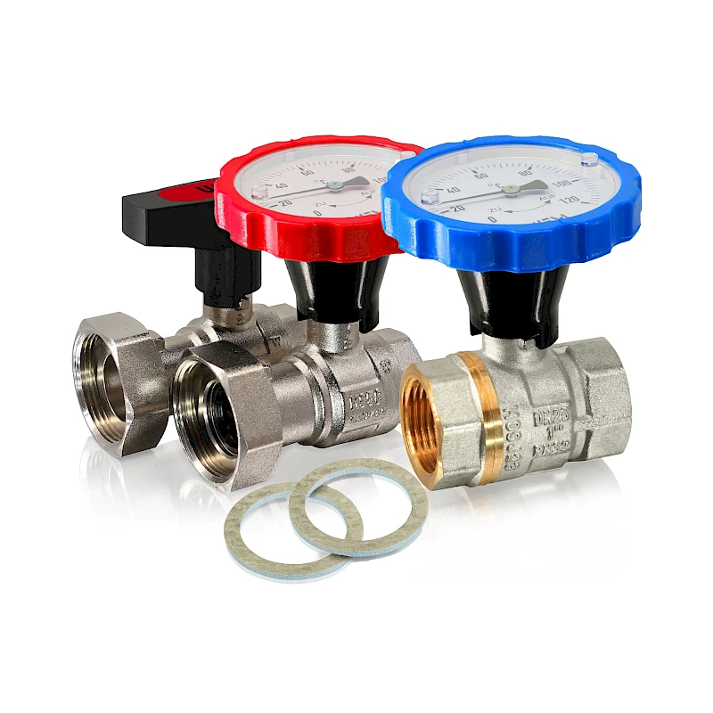 Thermometer pump ball valve with gravity brake, pump ball valve T-handle, incl. union nut + sealing
