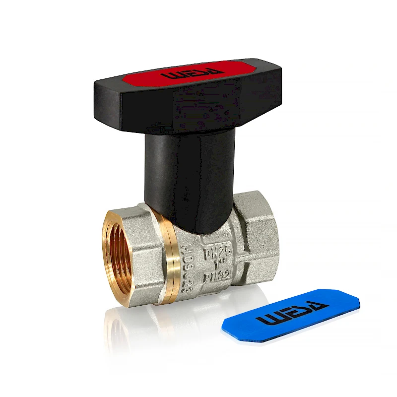 Geh./Kugel/Dicht. CW617N/CW614N/PTFE/FKM, T-Griff Nylon schwarz mit ABS-Clip (rot-blau) und Isolierhülse, voller Durchgang