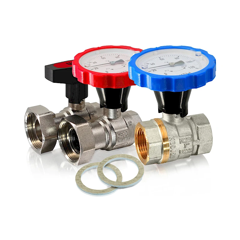 Pumpen-Kugelhahn Thermometer mit Schwerkraftbremse, Pumpen-Kugelhahn T-Griff, inkl. Überwurfmutter + Dichtung