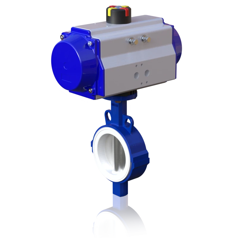 Geh./Scheibe/Dicht. GGG40/1.4408/ PTFE, pneum. Antrieb PD07 doppeltwirkend, Drehmoment 183 Nm/Steuerdruck 6 bar